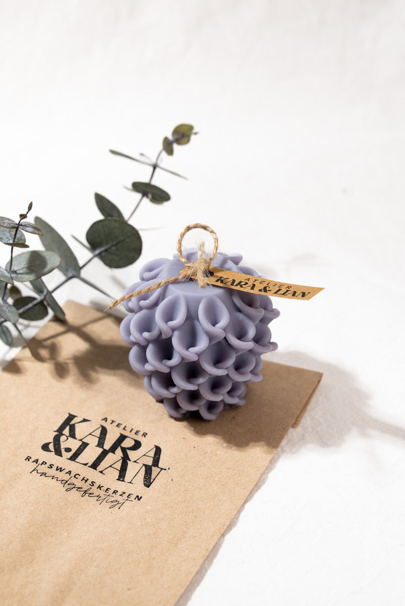 Unsere skulpturalen Kerzenformen sind keine standartisierten Stumpenkerzen, weshalb manche Formen beim Brennen zum Tropfen oder Auslaufen neigen. Platziere die Kerze auf einem Untersetzer und lasse das überschüssige Wachs abkühlen, bevor du es entfernst.